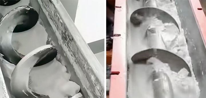 | 脫硫石膏粉 | 粒徑 60-100 目,濕度 8%-15%,易結(jié)塊,粘性較強(qiáng) | LS250、LS315、LS400(帶防堵結(jié)構(gòu)) | 2-25 | 8-50 | 螺旋葉片配耐磨襯板,選用低速大螺距設(shè)計(jì),轉(zhuǎn)速 20-40r/min,加裝清堵裝置和倉(cāng)壁振動(dòng)器 |