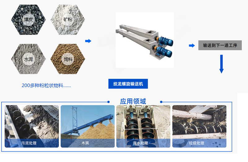 絞龍螺旋輸送機(jī)通常水平或略微傾斜使用,作為輸送半固體材料的有效方式,包括飼料、糧食、面粉、玉米、大豆、垃圾、木屑、骨料、污泥、固體廢物等,每小時輸送量在1.4-458立方米,輸送長度可達(dá)70米。