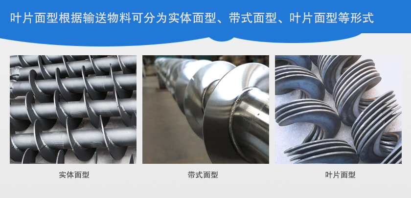 絞龍螺旋輸送機(jī)旋轉(zhuǎn)軸上焊有螺旋葉片,葉片面型根據(jù)輸送物料可分為實(shí)體面型、帶式面型、葉片面型等形式。