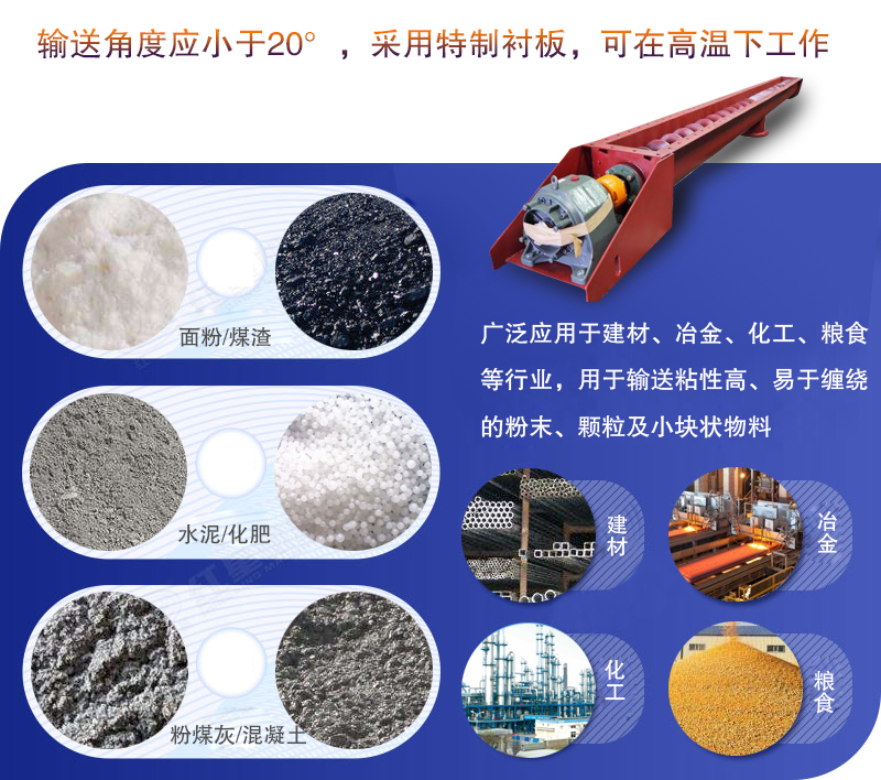 無(wú)軸螺旋輸送機(jī)廣泛應(yīng)用于建材、冶金、化工、糧食等行業(yè),用于輸送粘性高、易于纏繞的粉末、顆粒及小塊狀物料,其輸送角度應(yīng)小于20°,采用特制襯板,可在高溫下工作。